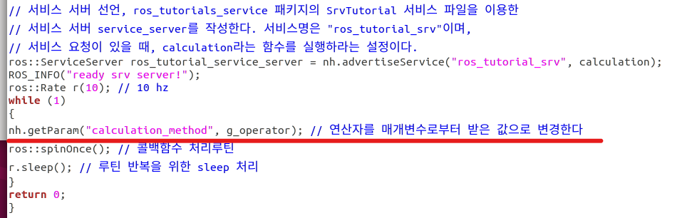 추가적으로 아까 서비스를 만들 땐 서비스 요청이 오기 전까지는 무조건 대기하는 것이였다. 하지만 이번에는 중간중간에 파라미터를 확인하려고 루프를 돌게 해놨다.