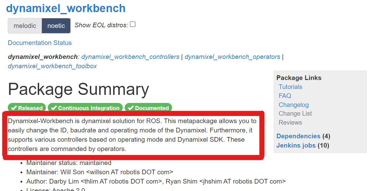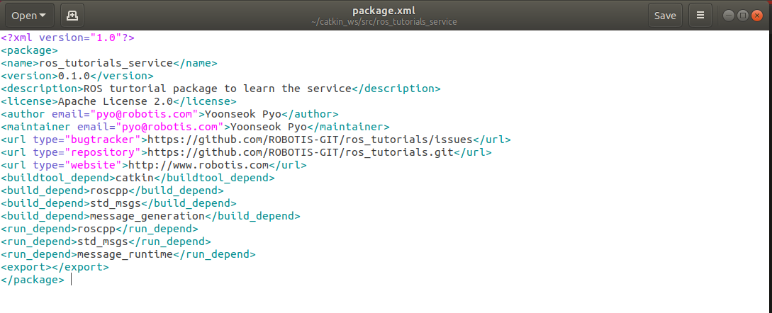 <maintainer email="pyo@robotis.com">Yoonseok Pyo</maintainer> 초반에는 maintainer과 author가 동일인물인 경우가 있지만 나중에 업데이트하다가 maintainer가 바뀌어서 관리 될 수도 있다.