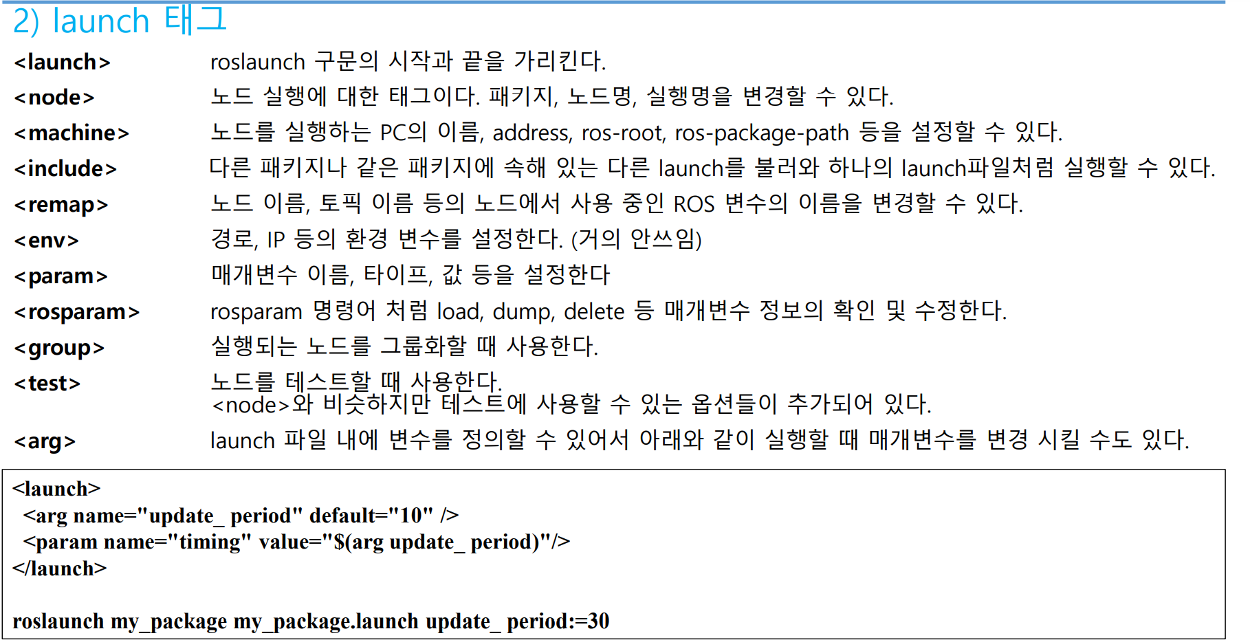 roslaunch는 xml기반이며 태그별 옵션을 제공한다. .launch라는 파일을 사용하여 설정한다.