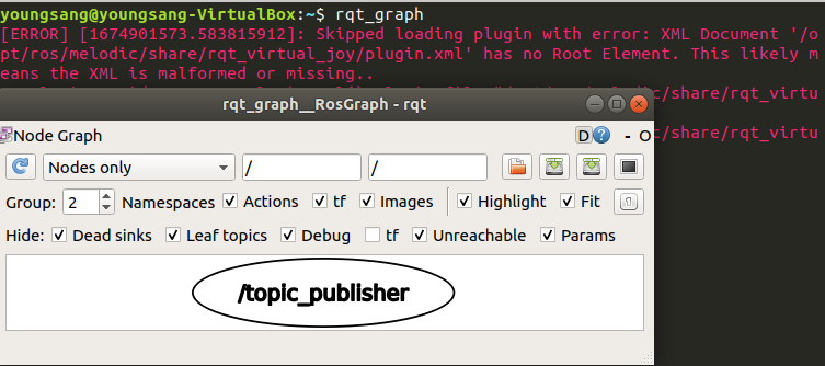 단, 이때 rqt_graph를 확인 했을때 노드 하나만 실행되었으므로 퍼블리셔 노드가 위의 터미널에 나온대로 메세지를 발행 하는 것이 아니라 아직은 단순히 ROS_INFO만 하고 있는 것이다. (근데 아래의 rostopic list, info를 확인해보면 발행은 되고 있는 듯하다. 내 생각)