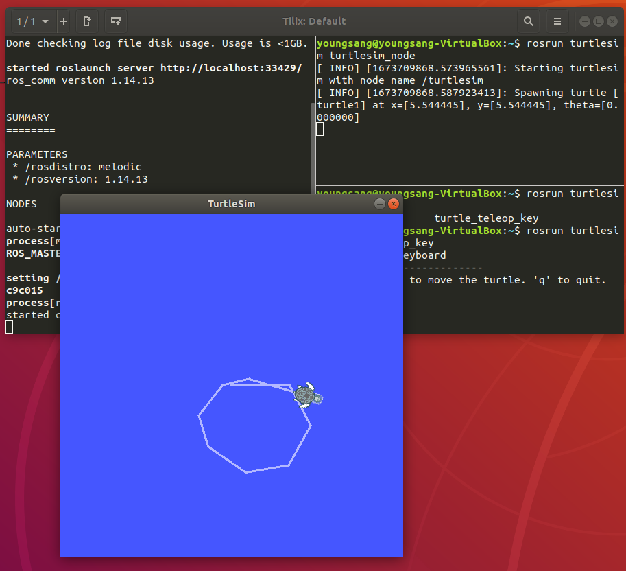명령어에서 확인할 수 있듯이 teleop key 터미널을 한번 클릭하고 키보드를 움직이면 거북이가 발자취를 남기면서 이동한다.
