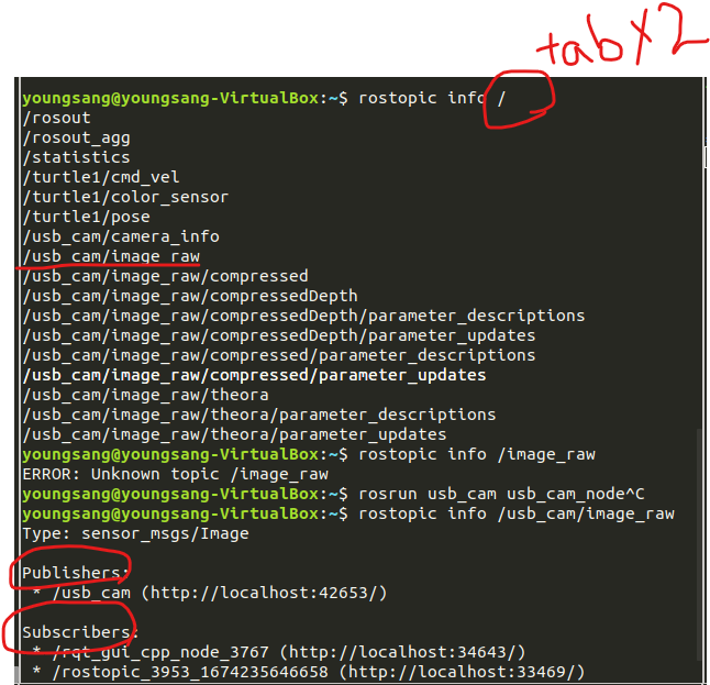 1행 3열에는 2행 3열에서 확인한 topiclist 중에 내가 알고자 하는 topic에 대한 정보를 알 수 있도록 하였는데 이 부분이 강의 내용과 조금 달랐다. 왜냐하면 나는 uvc_camera가 아닌 usb_cam을 사용하기 때문이다. 때문에 rostopic info /에 대한 명령도 조금 다를 수밖에 없었는데 이를 파악하기 위해 두 번 탭을 사용하였다.